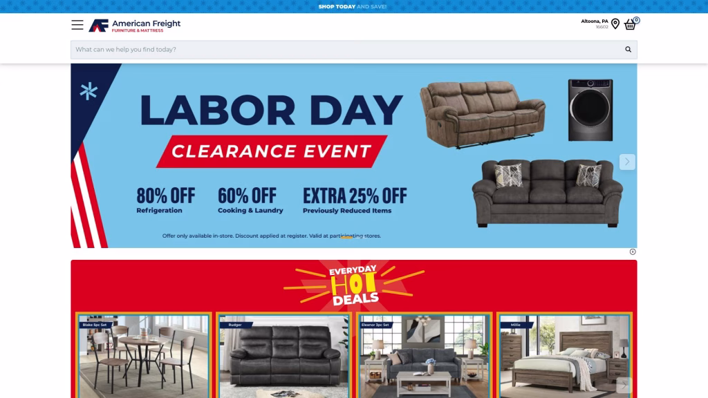 Highlights: They have 328 stores in 18 states. Their philosophy is “Quality at low prices”. They offer budget bedroom and living room sets along with mattresses. They often sell goods at significant discounts (purchasing items from Sears Outlet stores after rebranding). They offer installment plans and a 30-day return policy, however, a major drawback is that items purchased from the sales section cannot be returned as noted on their official website.